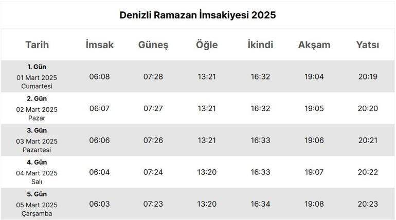 Denizli İmsakiye 2026: Ramazan Ayı Takvimi