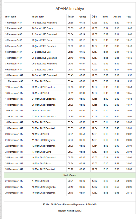 | 2. Gün 20 Şubat 2026 Cuma | 06:26 | 07:47 | 13:28 | 16:29 | 18:59 | 20:15 |